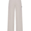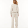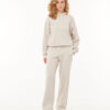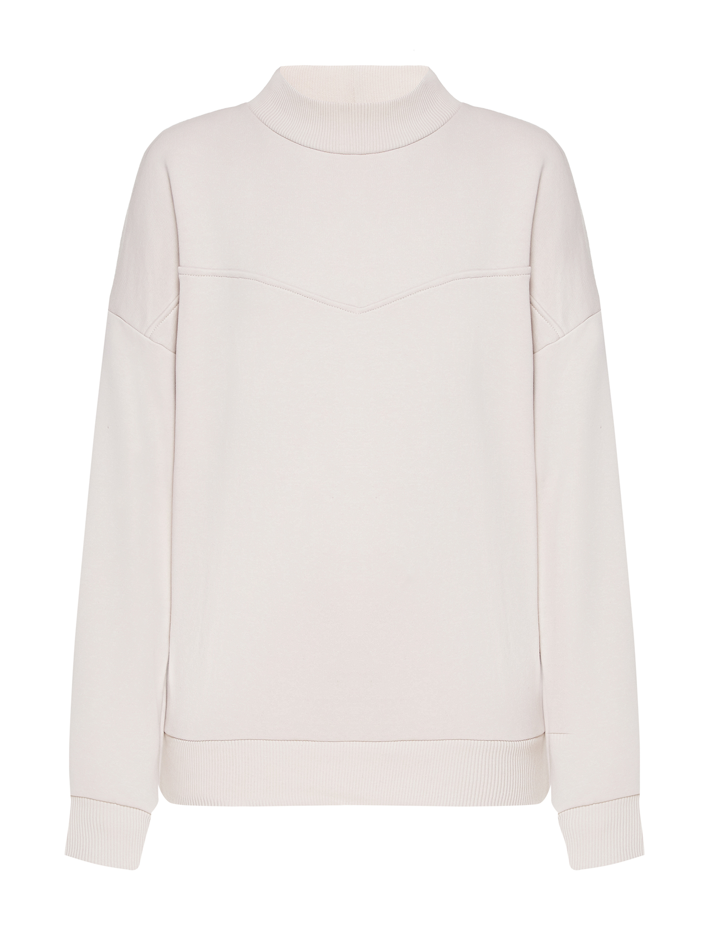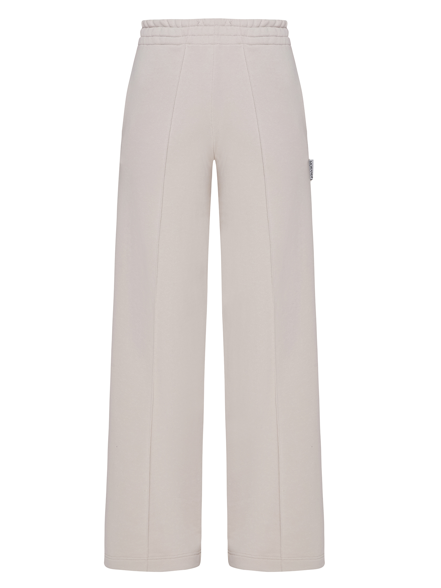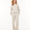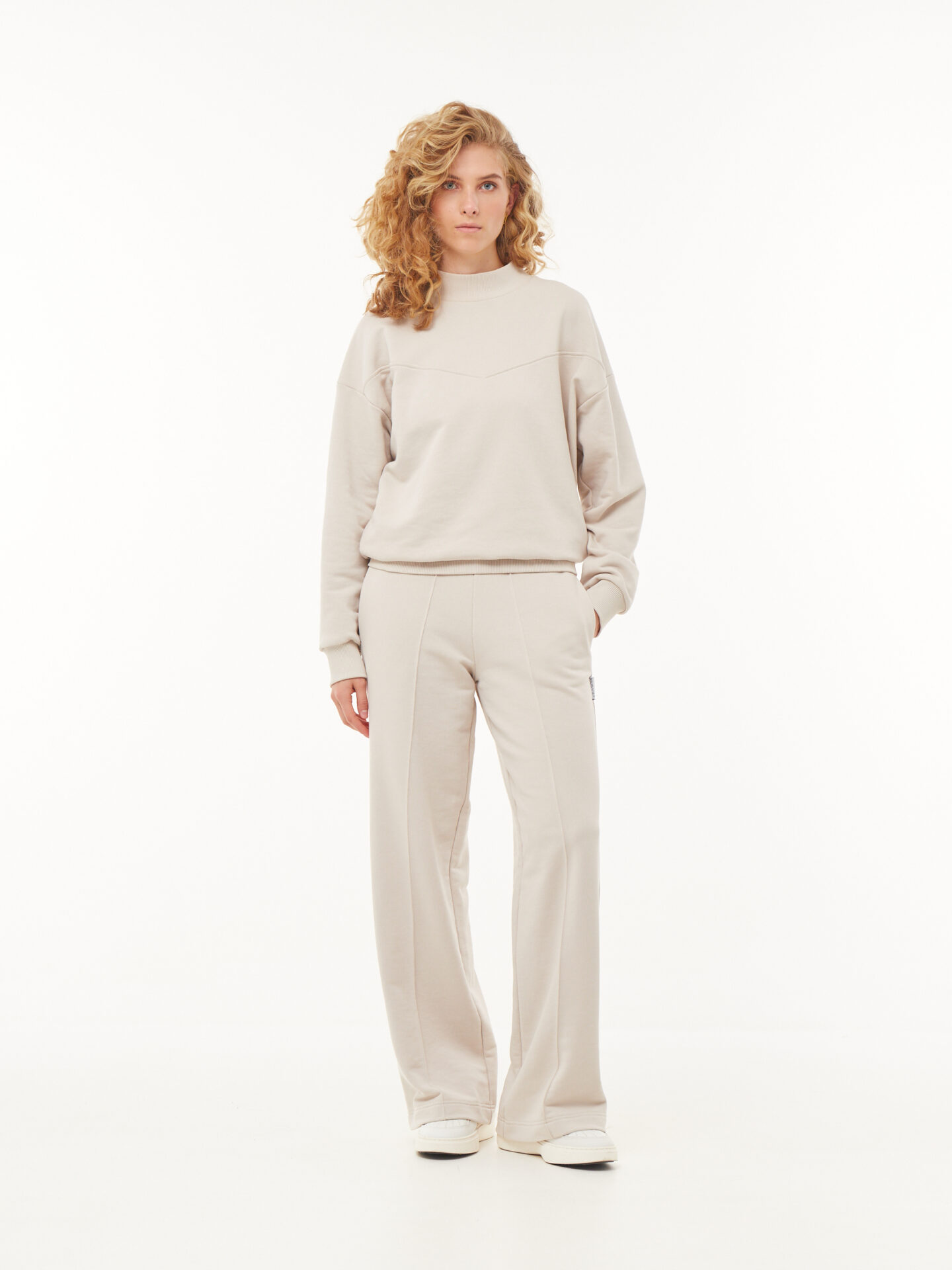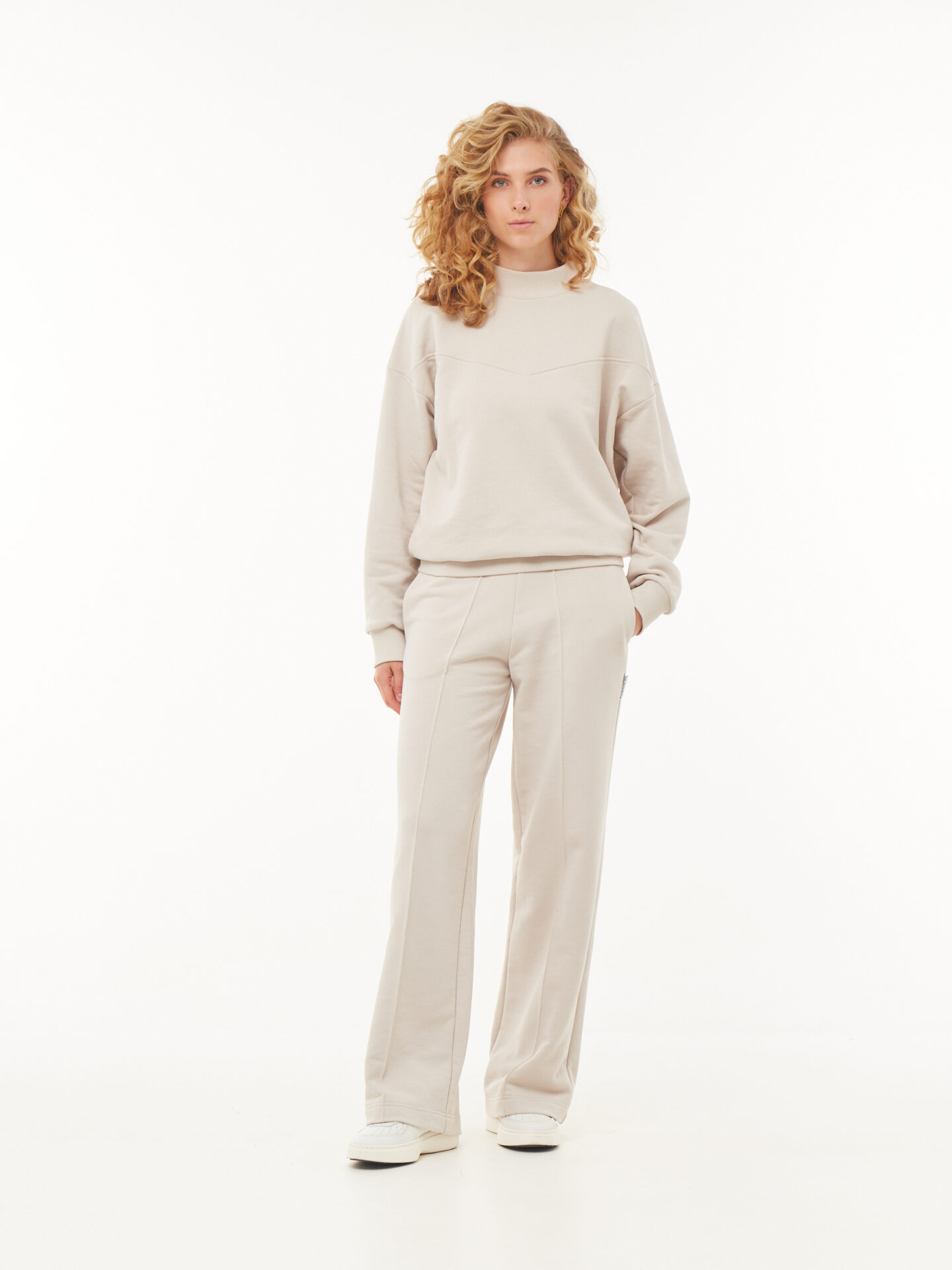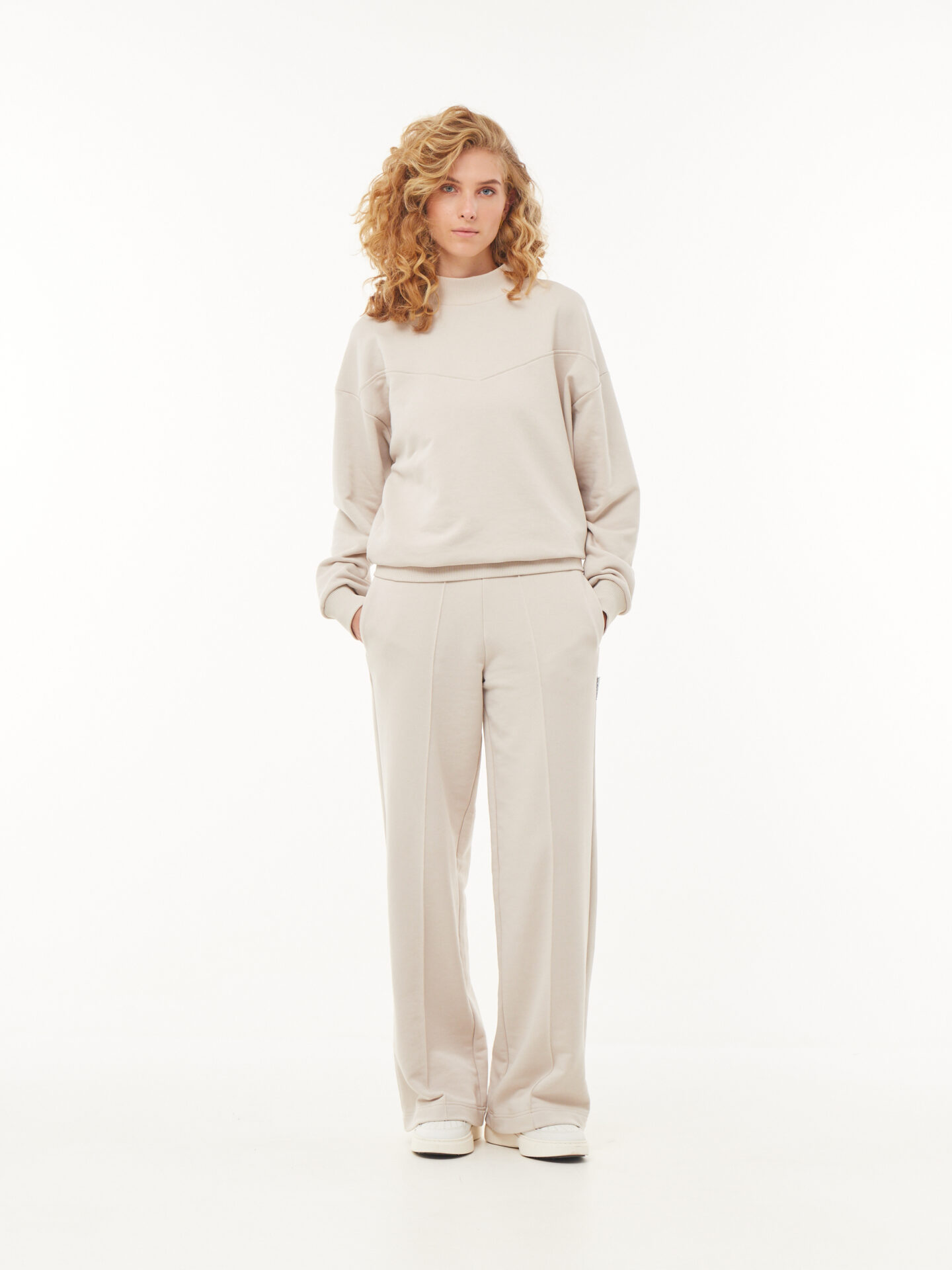 The knitted set consists of a sweatshirt and straight pants. Comfortable loose hooded sweatshirt with lowered shoulder line, cuffs and bottom with elastic band. Straight cut pants with decorative stitching on the front. Convenient side seam pockets and elastic waistband.