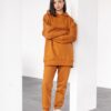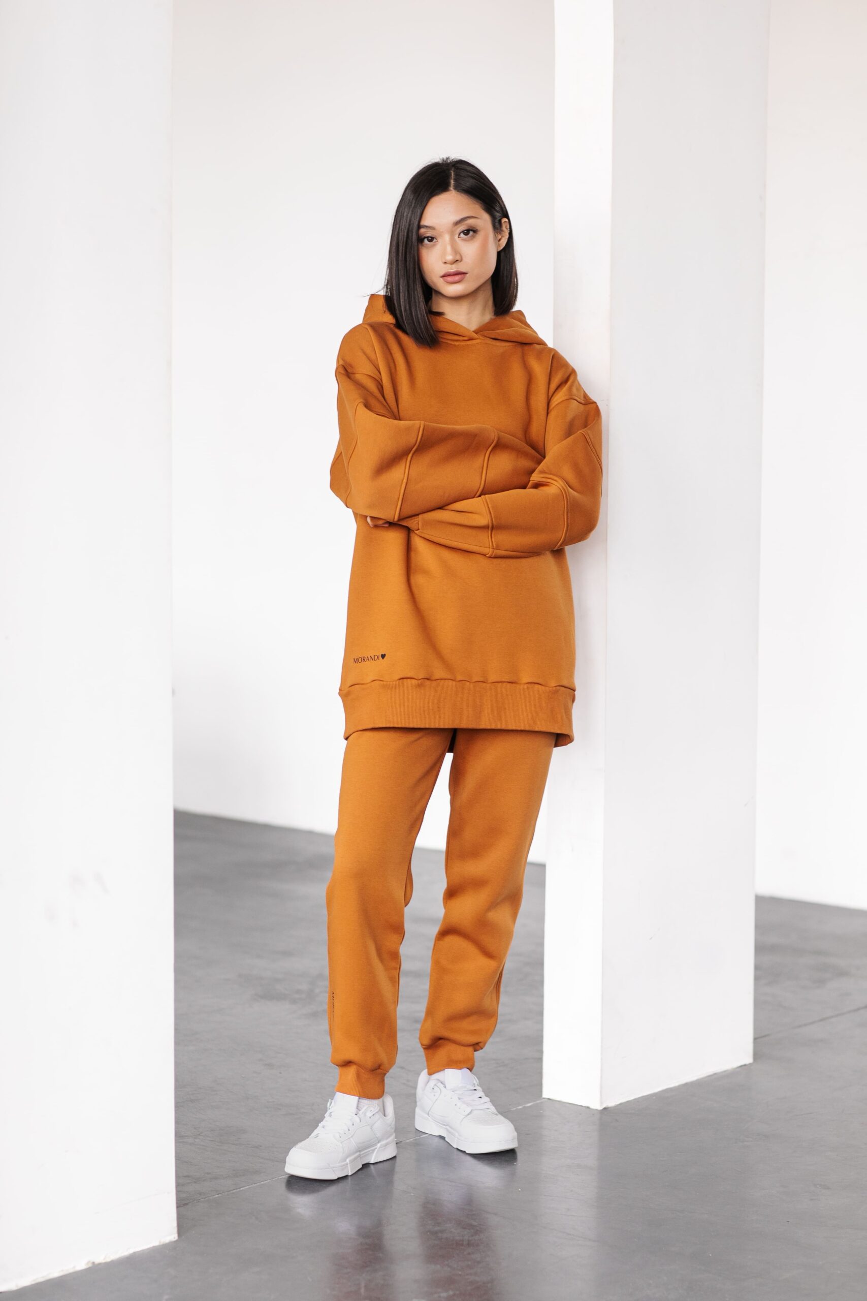 Hoodie is insulated, loose-fitting with a hood and pockets. Jogger pants with an elastic waistband. The product is made of thick knitwear with fleece.