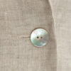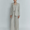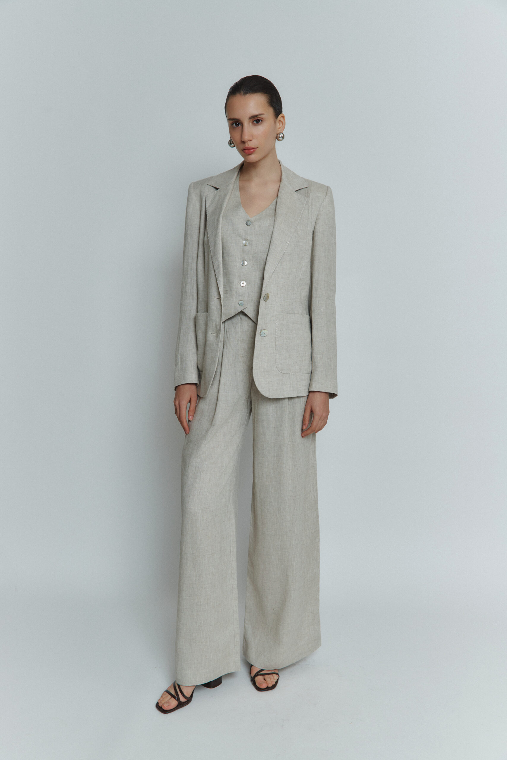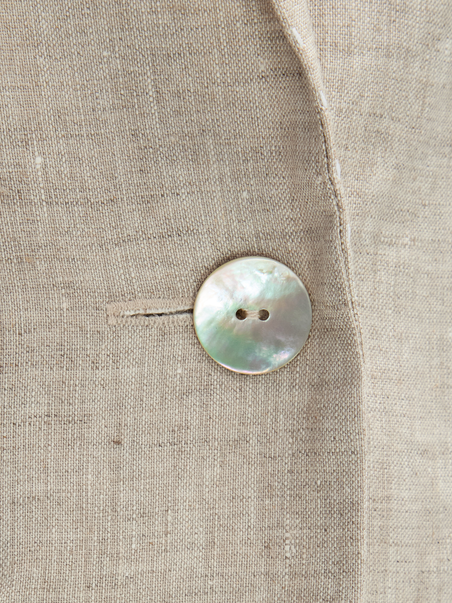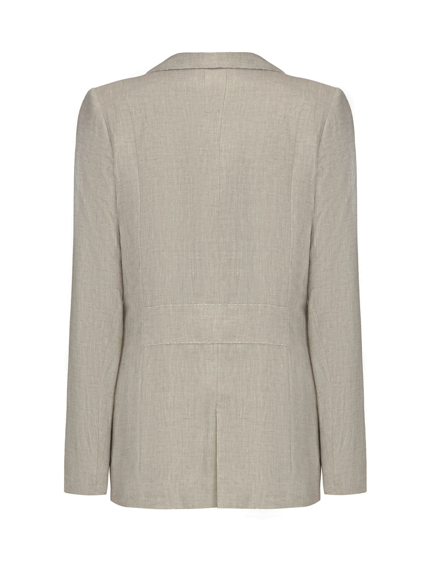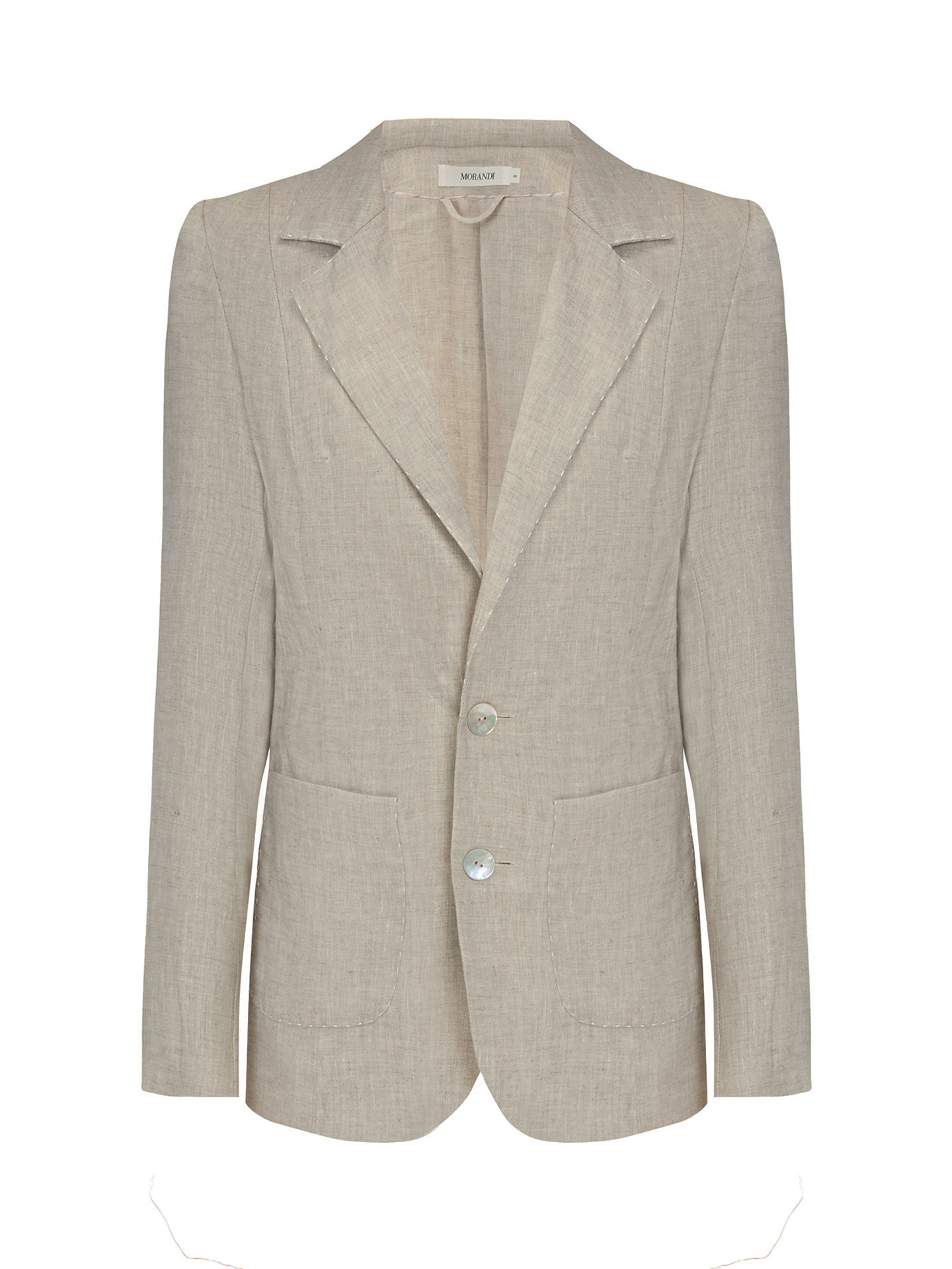 Jednorzędowa lniana marynarka o lekko dopasowanej sylwetce. Posiada pionowe reliefy kształtujące sylwetkę, klasyczny kołnierzyk w stylu marynarki i naszywane kieszenie. Model ma podszewkę z lnu i posiada ozdobną lamówkę wewnątrz. Marynarka wykończona jest kontrastowym białym, ręcznym szwem i dwoma guzikami z masy perłowej z naturalnej muszli. Ramiona delikatnie podkreślono poduszkami naramiennymi.
