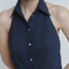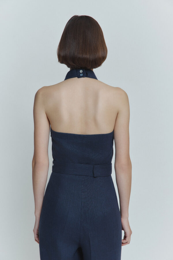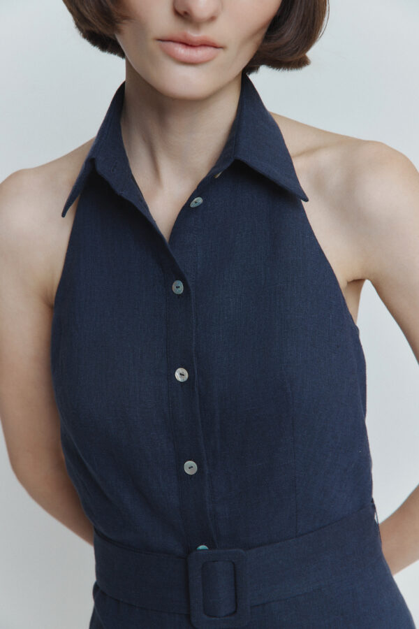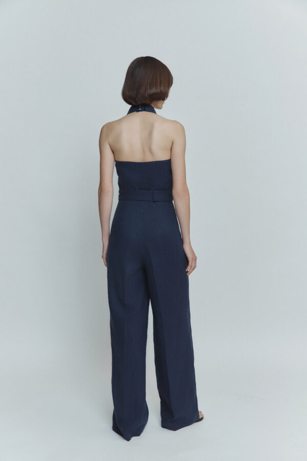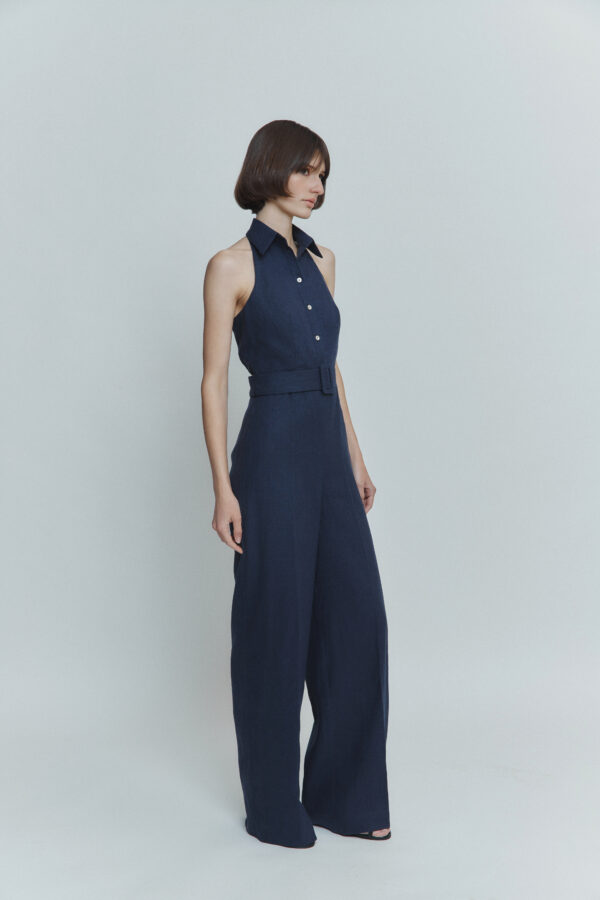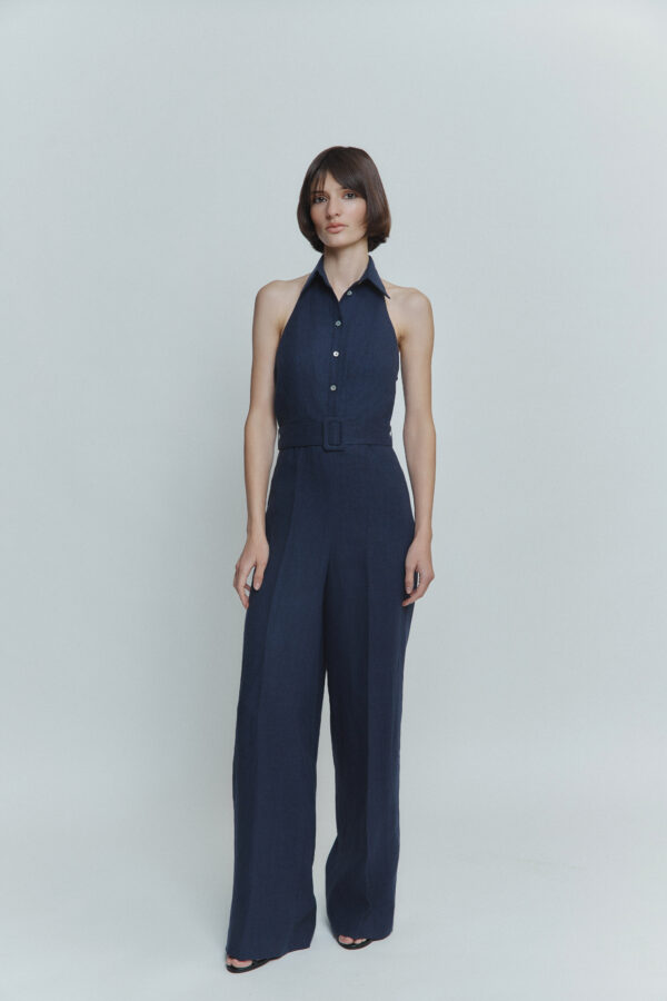 Ten niebieski lniany kombinezon to połączenie lakonicznego fasonu, wygodnego kroju i akcentu na plecach. Odkryte plecy nadają stylizacji delikatnej elegancji, a naturalny materiał zapewnia komfort nawet w najgorętsze dni. Idealny na letnie spacery, wakacje czy wyjątkowe chwile.