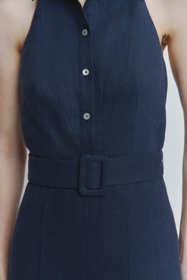 Model zapinany jest z przodu na guziki z naturalnej muszli — każdy detal został stworzony z miłością do naturalnego piękna. Z tyłu szyi znajduje się dodatkowe zapięcie, które zapewnia wygodne dopasowanie. Odpinany pasek pozwala podkreślić talię lub stworzyć luźniejszą sylwetkę — w zależności od nastroju.