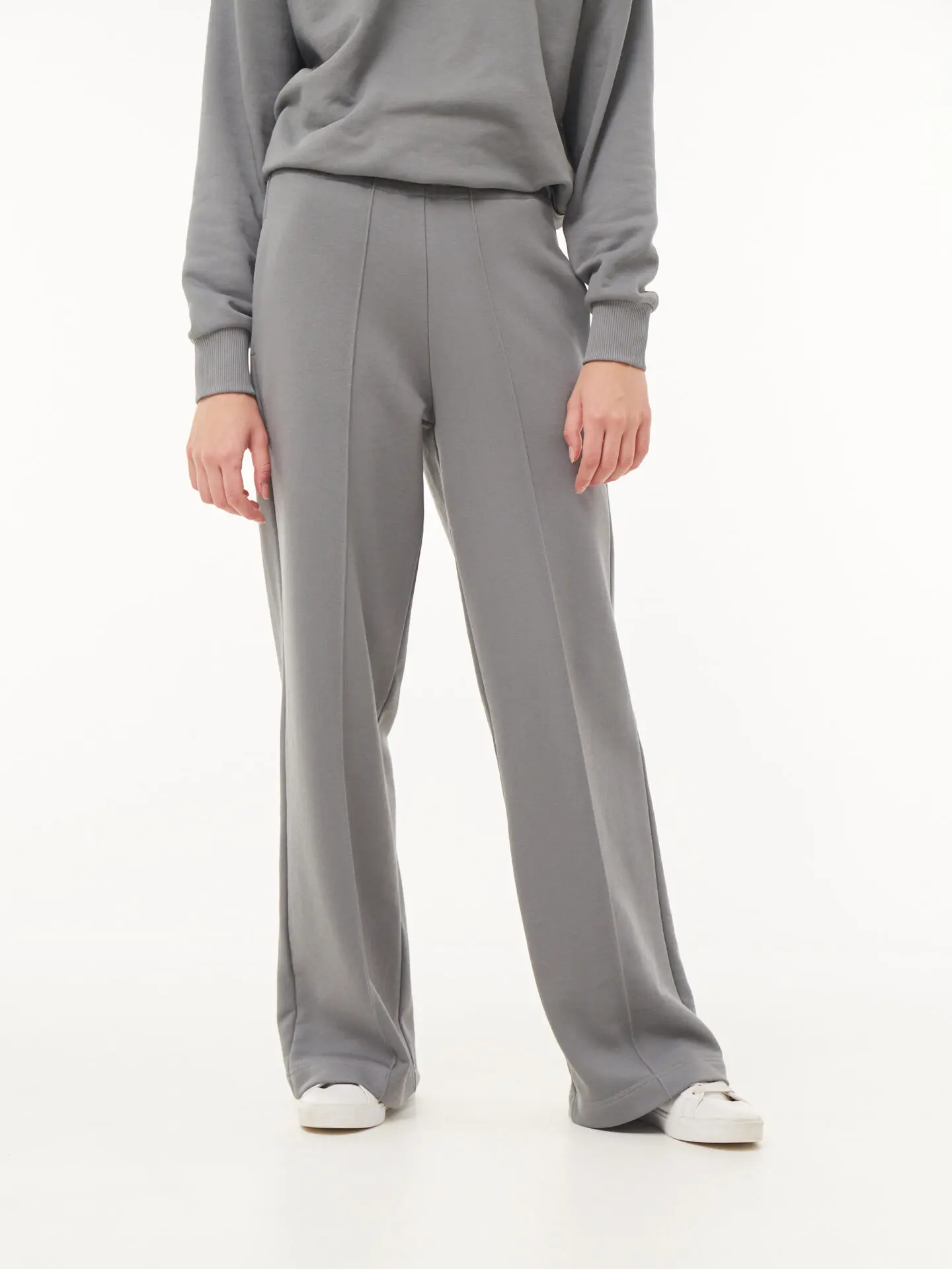Klasyczny fason z prostą nogawką dobrze układa się na sylwetce i daje poczucie swobody. Ozdobne przeszycia z przodu subtelnie podkreślają linię nóg i dodają całości bardziej uporządkowanego wyglądu. To detal, który sprawia, że spodnie nie wyglądają zbyt basic.